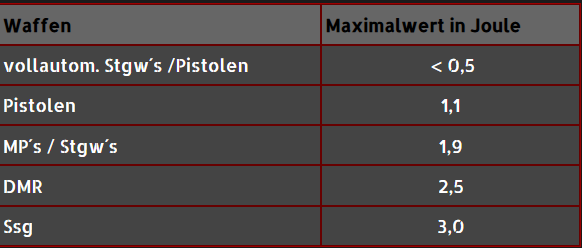 - Es sind generell ASGs* bis 3,0 Joule erlaubt. Bis 0,5 Joule ist Automatik erlaubt und über 0,5 Joule lediglich semi- automatik (Bundesvorschrift).